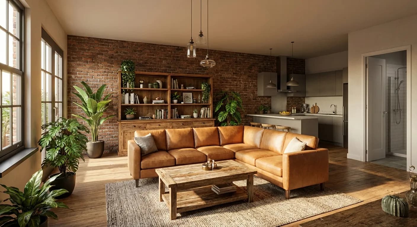 Exposed brick, metal details, raw materials